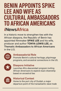 In a historic move to strengthen ties with the African diaspora, the Republic of Benin has officially appointed acclaimed filmmaker Spike Lee and his wife, producer and author Tonya Lewis Lee, as Thematic Ambassadors to African Americans in the United States.